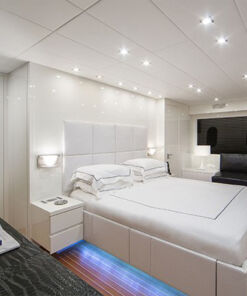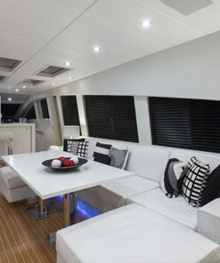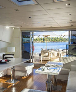 El Mega Yate 1 de Cabo VIP cuenta con un hermoso interior con suelos de teca de luz y todo el interior de cuero blanco, ofrece la combinación perfecta de serenidad y diseño moderno, es muy agradable a los sentidos. El salón principal cuenta con grandes, hermosos y cómodos sofás blancos a babor y estribor, además de cómodas salas de estar, lo que resulta un ambiente cómodo y relajante, proporcionando a todos los huéspedes a bordo. Dentro, hay una mesa de comedor para una cena formal, más unas agradables mesas de café de estribor y dobles a puerto. Y por supuesto, no puede faltar el sistema de entretenimiento y una barra hacia adelante.